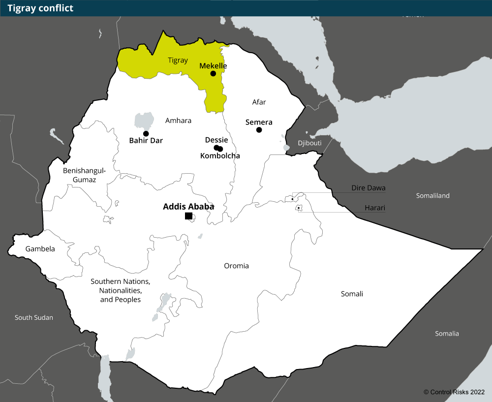 The conflict between federal armed forces and militias allied to the Tigray People's Liberation Front (TPLF) will likely persist in northern parts of the country in 2022. The conflict in August 2021 expanded into border regions of neighbouring Amhara and Afar regional states, though the federal government reclaimed territories across all three regional states in December 2021. Despite significant international pressure, prospects for a negotiated settlement remain unclear given the entrenched positions of both sides. Persistent reports of human rights abuses committed by both sides and the apparent reluctance of the federal government to address the dire humanitarian situation in Tigray will continue to attract international condemnation. Meanwhile, the conflict will also continue to strain government finances and undermine investor confidence.